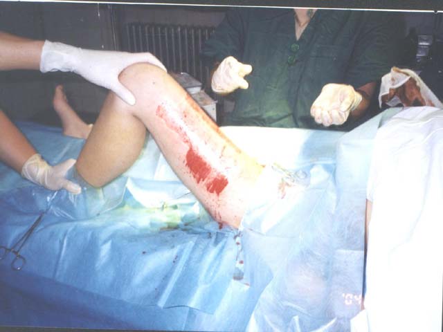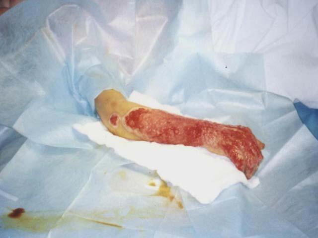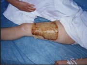 2004年6月8日,應(yīng)用燒傷皮膚再生療法治療第35天,食指伸肌腱因燒傷過(guò)于嚴(yán)重而液化清除,其余手指的肌腱部分壞死組織被無(wú)損傷清除后實(shí)現(xiàn)了肌腱原位再生重建,關(guān)節(jié)囊實(shí)現(xiàn)了再生,關(guān)節(jié)腔獲得修復(fù),生長(zhǎng)良好的肉芽組織基本將肌腱、骨骼和關(guān)節(jié)腔覆蓋。此時(shí),由于患者、家屬和單位提出盡快封閉創(chuàng)面的要求,結(jié)合患者創(chuàng)面的條件,及已應(yīng)用燒傷皮膚再生醫(yī)療技術(shù)處理創(chuàng)面35天(傷后43天)而沒(méi)有發(fā)現(xiàn)“皮島”生長(zhǎng),所以我們選擇了創(chuàng)傷較小的:“右前臂、右手清創(chuàng)+自體大張薄~中中厚皮移植+左大腿取皮術(shù)”,手術(shù)損傷小,手術(shù)過(guò)程安全順利,術(shù)后植皮區(qū)和供皮區(qū)均采用MEBO網(wǎng)紗包扎,創(chuàng)造再生修復(fù)的環(huán)境和再生物質(zhì)。術(shù)后第一天,供皮區(qū)按照燒傷皮膚再生醫(yī)療技術(shù)的要求進(jìn)行換藥,術(shù)后第9天實(shí)現(xiàn)中中厚皮供皮區(qū)生理性再生修復(fù),第21天外觀完全恢復(fù);植皮區(qū)術(shù)后第4天開(kāi)包換藥,所植皮片生長(zhǎng)良好,植皮成功率90%,然后,繼續(xù)使用再生醫(yī)療技術(shù)處理創(chuàng)面。