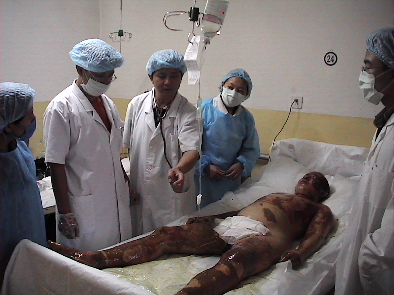 2004年9月4日13時許,石家莊化工化纖有限公司職工賈某因工作時不慎從五米高處摔下,跌入電石(乙炔氣)爐中,造成全堿燒傷,患者非常痛苦,呻吟不安,單位領(lǐng)導(dǎo)及同事家屬焦慮萬分,約四十分鐘后,由120急救車急送井陘礦務(wù)局醫(yī)院,井陘礦務(wù)局醫(yī)院接到急救通知后,早已嚴(yán)陣以待,緊急組織了以程二鎖院長、高保廷主任、潘紹田醫(yī)師及護理人員的搶救小組,做好了一切接受傷員的準(zhǔn)備工作。約13時30分,傷員急診入院,入住該院外二科ICU病房,入院時初步診斷:全身大面積特重度化學(xué)燒傷,面積達(dá)成87%,(深Ⅱ度—深Ⅲ度)即給予積極補充血溶量等抗休克救治,創(chuàng)面采用燒傷皮膚再生醫(yī)療技術(shù)全程外用濕潤燒傷膏行濕潤暴露治療。 傷后第二天,患者發(fā)生全身侵襲性感染,患者所在單位領(lǐng)導(dǎo)及醫(yī)院程院長急向北京中國燒傷創(chuàng)瘍科技中心求援,該中心迅速派出具有豐富的大面積燒傷患者救治經(jīng)驗的臨床部主任胡棟才前往救援。胡主任于當(dāng)天晚上20時到達(dá)醫(yī)院后,立即聽取病情匯報,深入病房查看病情,查閱所有輔助檢查結(jié)果,發(fā)現(xiàn)血常規(guī):白細(xì)胞總數(shù)由13×109下降到5×109,血小板147×109下降至78×109,肝功能見谷丙轉(zhuǎn)氨酶高達(dá)362u/L,結(jié)合病人精神差,腹脹明顯,體溫:39.5℃ 呼吸淺快:36次/分 心率快134次/分 口唇紫紺, 創(chuàng)面發(fā)紫并見片狀出血點等綜合考慮,認(rèn)為患者已發(fā)生敗血癥及并發(fā)肝臟,心臟等臟器功能受損,胡主任當(dāng)機立斷,調(diào)整救治方案:給予高效、足量抗生素抗感染,加強心、腦、肺、腎、肝等多器官的維護及加強創(chuàng)面的處理等。經(jīng)上述搶救措施后,患者生命體征平穩(wěn)。 |