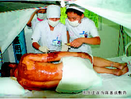 拿不出錢來繳交醫(yī)藥費!原在達濠腰果廠工作的她下崗多年,身體不好,家庭經(jīng)濟情況并不寬裕。四個孩子雖已陸續(xù)外出零散打工,但養(yǎng)活自己都頗不容易,老倆口的生計還得靠陳基成每月數(shù)百元的收入支撐著。就在她著急傷心之際,華僑醫(yī)院的醫(yī)生們沒有計較陳家是否已繳交了醫(yī)藥費,立即展開了急搶工作——他們及時給陳基成使用了TAT常規(guī)破傷風抗毒素針、為他擦燒傷膏、拍X光片……在進行一系列及時急救的同時,發(fā)現(xiàn)病情并不簡單。一個電話隨后從華僑醫(yī)院打到治療燒傷更為權(quán)威的駐汕海軍醫(yī)院燒傷創(chuàng)瘍治療中心:“我們醫(yī)院來了一位救人英雄,經(jīng)初步診斷及急救后,現(xiàn)建議把他轉(zhuǎn)送到你們醫(yī)院! 轉(zhuǎn)院,讓救人者及時得到更好的救治 上午11點40分:救護車呼嘯著沖進汕頭海軍醫(yī)院燒傷創(chuàng)瘍治療中心。仍昏迷不醒的陳基成在達濠華僑醫(yī)院醫(yī)生的護送下前來接受救治。部隊醫(yī)護人員“嚴陣以待”。在他們到達之前,根據(jù)華僑醫(yī)院的簡明介紹,由一位姓葉的主任醫(yī)師牽頭組成的救治小組已經(jīng)初步形成多個急救方案。 根據(jù)診斷,陳基成全身燒傷面積達30%,其中III度燒傷面積10%,深I(lǐng)I度、II度燒傷面積達20%。由于他沖進火場救人時呼吸道吸入了火苗或濃煙,屬于重度燒傷合并吸入性損傷,隨時都有生命危險。在緊急關(guān)頭,白蛋白拿來了,各種平衡液拿來了,吸氧、輸液、傷口處理……海軍醫(yī)院的醫(yī)生們?yōu)殛惢蛇M行了系統(tǒng)抗休克處理,用強心、利尿、抗感染藥物,保護臟器功能。采用皮膚再生醫(yī)療技術(shù)暴露療法,輔以壞死層薄化技術(shù),以阻止被燒傷壞死組織的進行性加深,使藥物能迅速滲入。 上午11時55分:在汕頭北區(qū)打工的陳基成的小兒子趕到醫(yī)院,見到父親被燒成這個樣子,急得直流眼淚。“我們家那么窮,到哪里去籌一筆錢來救我父親。俊贬t(yī)生護士們都來安慰他,“你爸爸的事跡讓大家都很受感動,別慌,醫(yī)院領(lǐng)導(dǎo)說了,救死扶傷是我們的職責。” 陳基成蘇醒了,說出的第一句話是:“奴仔無事吧?” 下午2時20分:經(jīng)醫(yī)生救治一個多小時后,陳基成慢慢蘇醒過來。迷迷糊糊中,他的第一句話便說:“幾個奴仔無事吧?”醫(yī)生和護士們無不動容!一旁護理的兒子告訴他,孩子們沒事,他們一家都沒事。陳基成嗯了一聲,輕嘆口氣,又昏睡了過去…… 下午3時35分:記者聞訊趕往駐汕海軍醫(yī)院燒傷創(chuàng)瘍治療中心。在住院部2樓重癥病房,醫(yī)院的醫(yī)生和護士們正在為陳基成進行燒傷創(chuàng)面的壞死層薄化處理。主管救治工作的葉主任告訴記者,“由于病人呼吸道有吸入性損傷,可能導(dǎo)致肺部功能異常,內(nèi)循環(huán)發(fā)生改變,隨時會有生命危險。所以我們一早都做好準備,必要時切開病人的氣管,確保其肺部通暢! 病房外,被陳基成救出的三個孩子的父親陳基通帶著哭腔對記者說,一家子就靠他賣廢品養(yǎng)活,現(xiàn)在家燒了,連一百元都沒能拿出來為恩人治病…… 盡管尚未墊付一分錢醫(yī)療費,海軍醫(yī)院上下為陳基成進行了特別護理,并做好了應(yīng)急救護準備。 本報記者將繼續(xù)跟蹤報道。本報記者林琳蘇碩元陳江 |