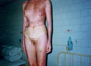 事情經(jīng)過是這樣的:2004年9月6日晚上11時,53歲的羅某某正在廚房煮東西時,不慎發(fā)生煤氣爆燃并引燃了身上的衣物而將全身燒傷。傷后約半小時,羅某被送到了桂林市第四人民醫(yī)院燒傷治療中心,值班醫(yī)師陳熙馬上對患者進行診治,經(jīng)檢查:患者皮膚除了三角內褲的區(qū)域和足底外,其他部位均被不同程度燒傷,其中雙手、雙上肢、腰背部、雙下肢背側的燒傷深度較深,表現(xiàn)為:表皮脫落,部分紅白相間,部分呈蠟白色,腫脹滲出少,痛覺喪失。入院診斷:大面積特重度燒傷(89%TBSA,淺II度59%、深II度25%、III度淺型5%)。 患者入院后,燒傷治療中心的古風主任和李潔護士長馬上趕到病房,組織展開搶救治療,唐建東業(yè)務院長聞訊后也趕到病房組織指揮搶救。由于治療方法正確,護理措施到位,患者平穩(wěn)、順利地度過了休克期。在創(chuàng)面修復期,全科人員積極主動配合,按照規(guī)范的燒傷皮膚再生醫(yī)療技術規(guī)范處理創(chuàng)面,同時注重心理治療和護理,消除了患者對不良預后的疑慮,增強了戰(zhàn)勝疾病的信心,使得患者積極配合治療和護理。 |