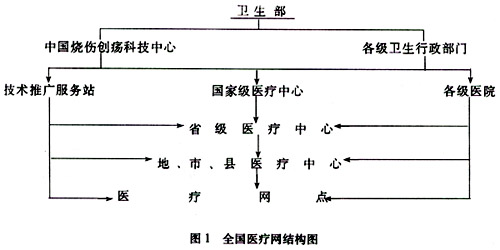 第一屆燒傷創(chuàng)瘍學術會議前后,北京光明中醫(yī)燒傷創(chuàng)瘍研究所以技術合作形式與全國近500 家醫(yī)院建立了技術醫(yī)療聯(lián)合作,推廣應用該項醫(yī)療技術。1989年9月,衛(wèi)生部發(fā)出(89)衛(wèi)科技成字第49號文,成立了中國燒傷創(chuàng)瘍科技中心,作為全國燒傷創(chuàng)瘍新技術推廣、開發(fā)、研究主管部門和技術總指導部門,在地方衛(wèi)生行政部門的支持下,在中央及地方醫(yī)院設立了燒傷創(chuàng)瘍醫(yī)療中心和醫(yī)療網(wǎng)點,形成了全國統(tǒng)一技術指導和指揮的燒傷創(chuàng)瘍醫(yī)療網(wǎng)。該醫(yī)療網(wǎng)的建立是世界歷史上規(guī)模最大收效最好的醫(yī)療救治組織。全國醫(yī)療網(wǎng)的主要結構如下:(見圖(l))